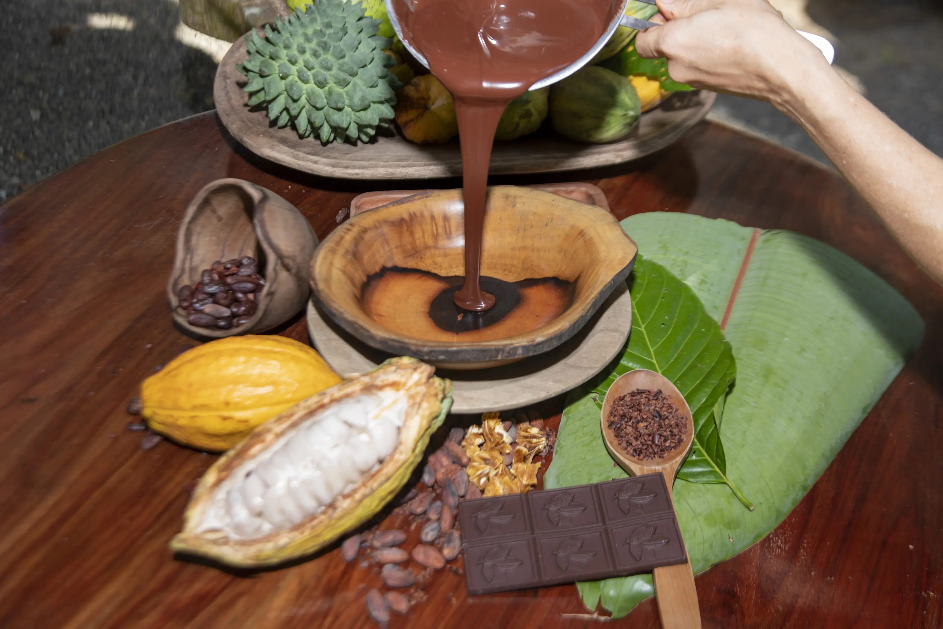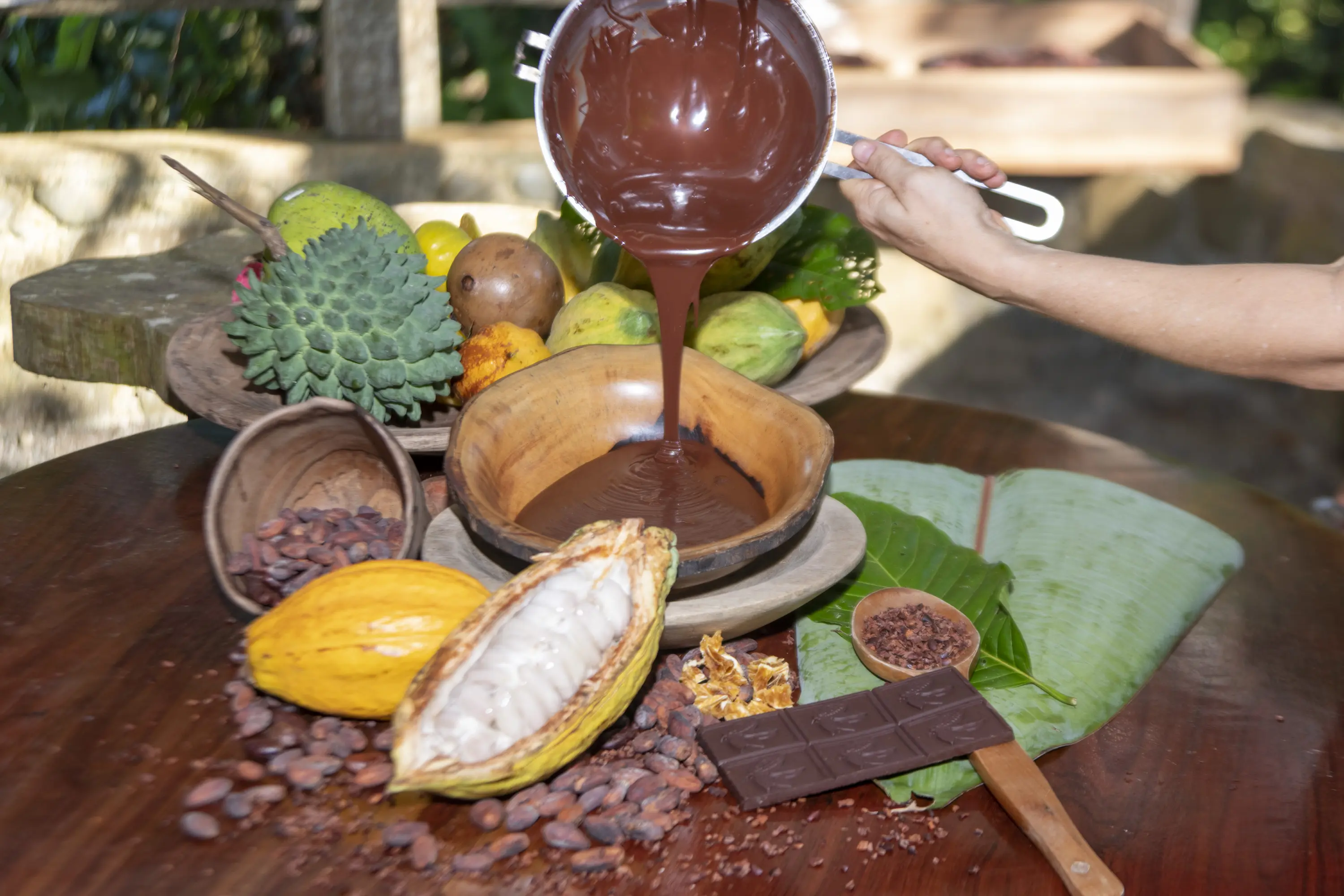Sample delicious seasonal fruit, such as Cacao (Chocolate), Anona, South American Sapote, Starfruit, and Mangosteen.