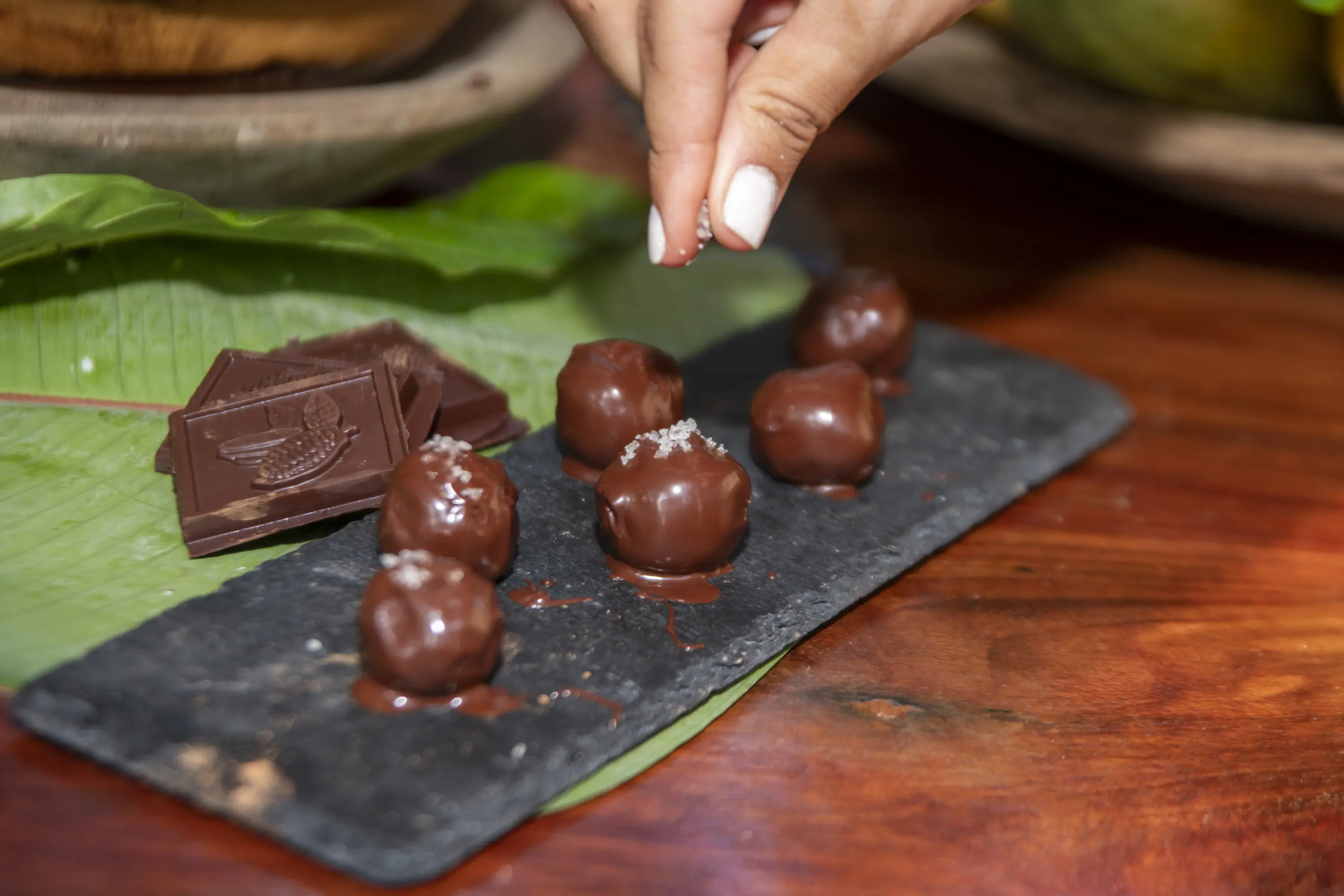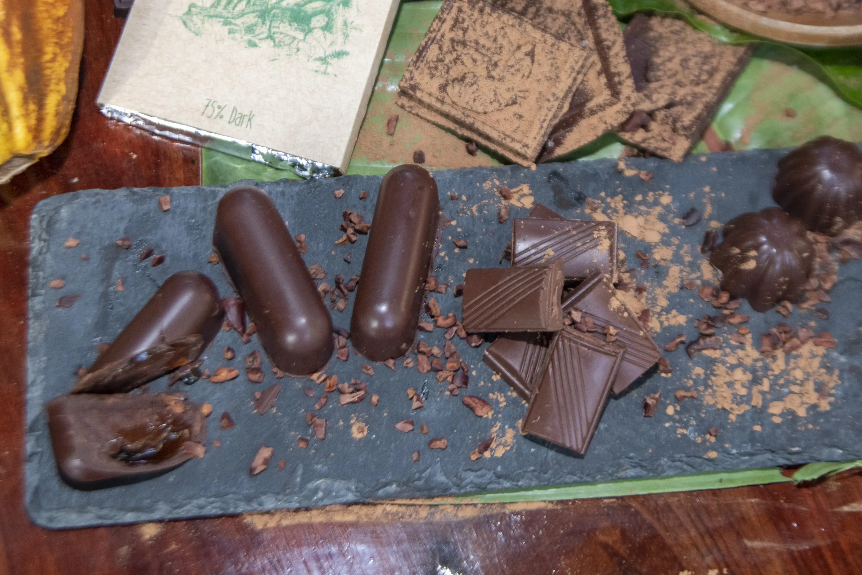 We have been growing cacao for more than 30 years but most or our efforts were wiped out in the 90s. We've recently started the replanting process and now, a few years later, we have begun making our own organic farm-to-bar chocolates right her at the lodge!